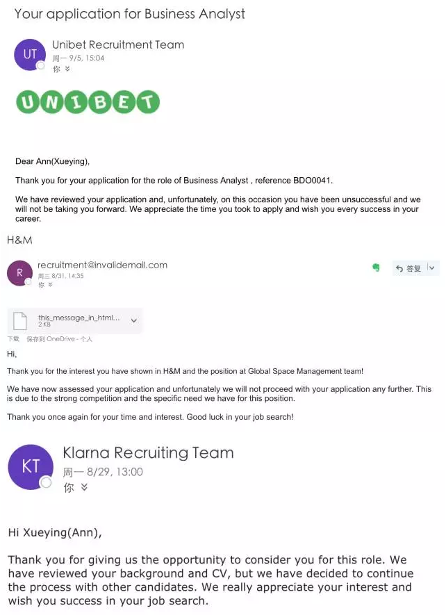 我还记得在一个周一,大概是我密集投简历后的2周,一天内我收到了5封拒信。当时的内心独白是:微笑,坚强地活着。