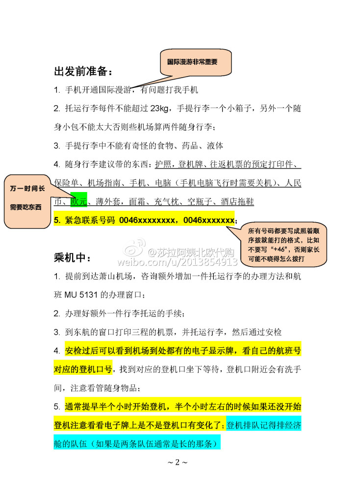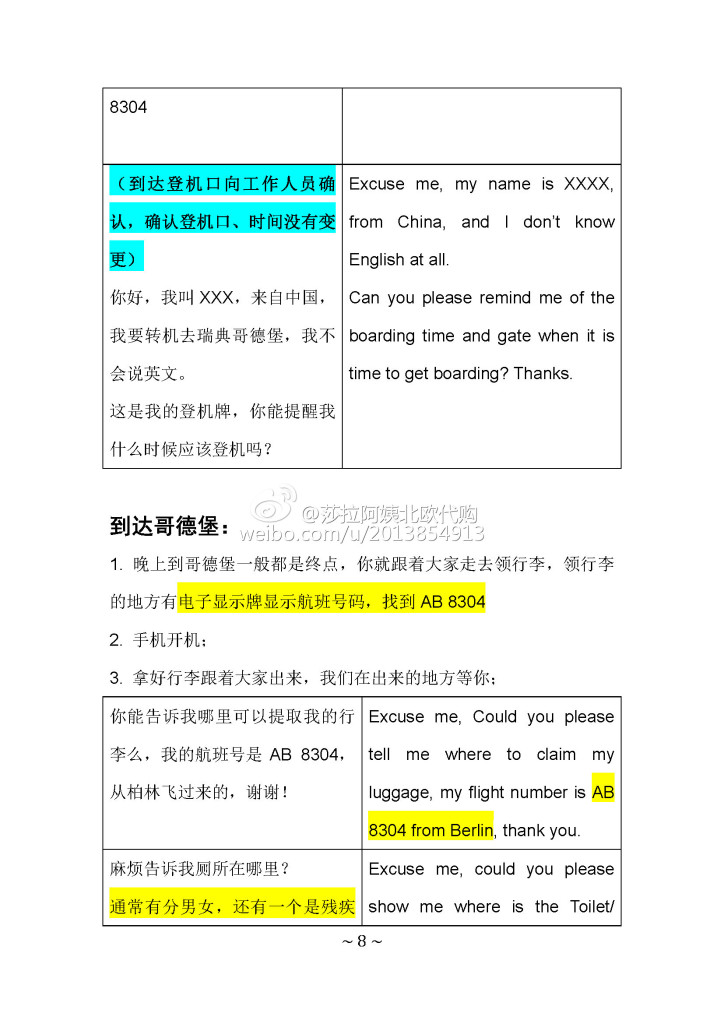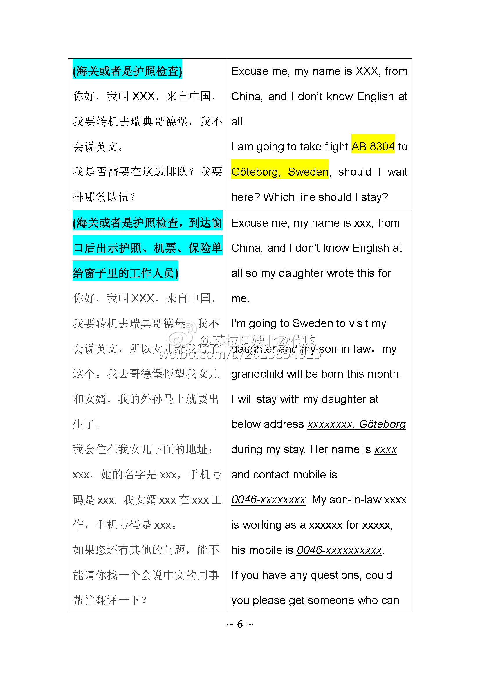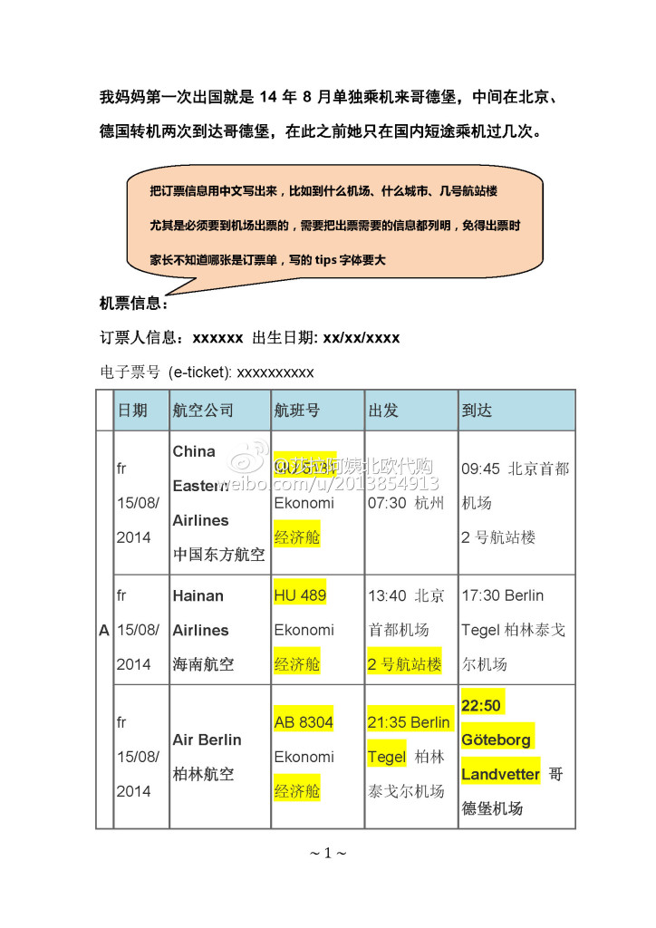 @莎拉阿姨北欧代购 我妈单独乘机来的哥德堡,转机2次,不会英文没出过国,定的是单程国航的机票。出发前我也挺担心的,做了最差的打算就是她到了德国要是没赶上来哥德堡的飞 机,我们再飞去德国接她。结果一切都顺利,这是给我妈准备的一些tips,分享给大家,一定要打印大的字体,老人眼神都不大好![[心] [心]](http://img.t.sinajs.cn/t4/appstyle/expression/ext/normal/40/hearta_org.gif)