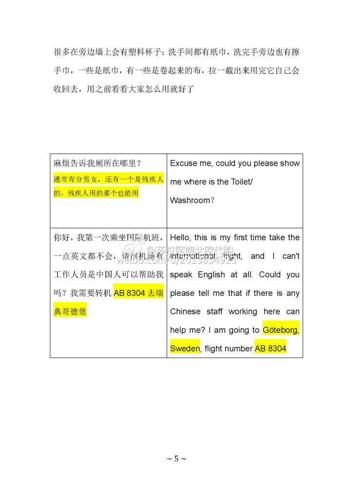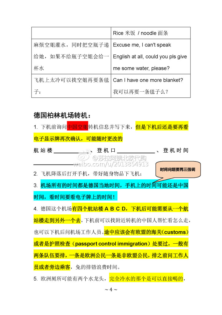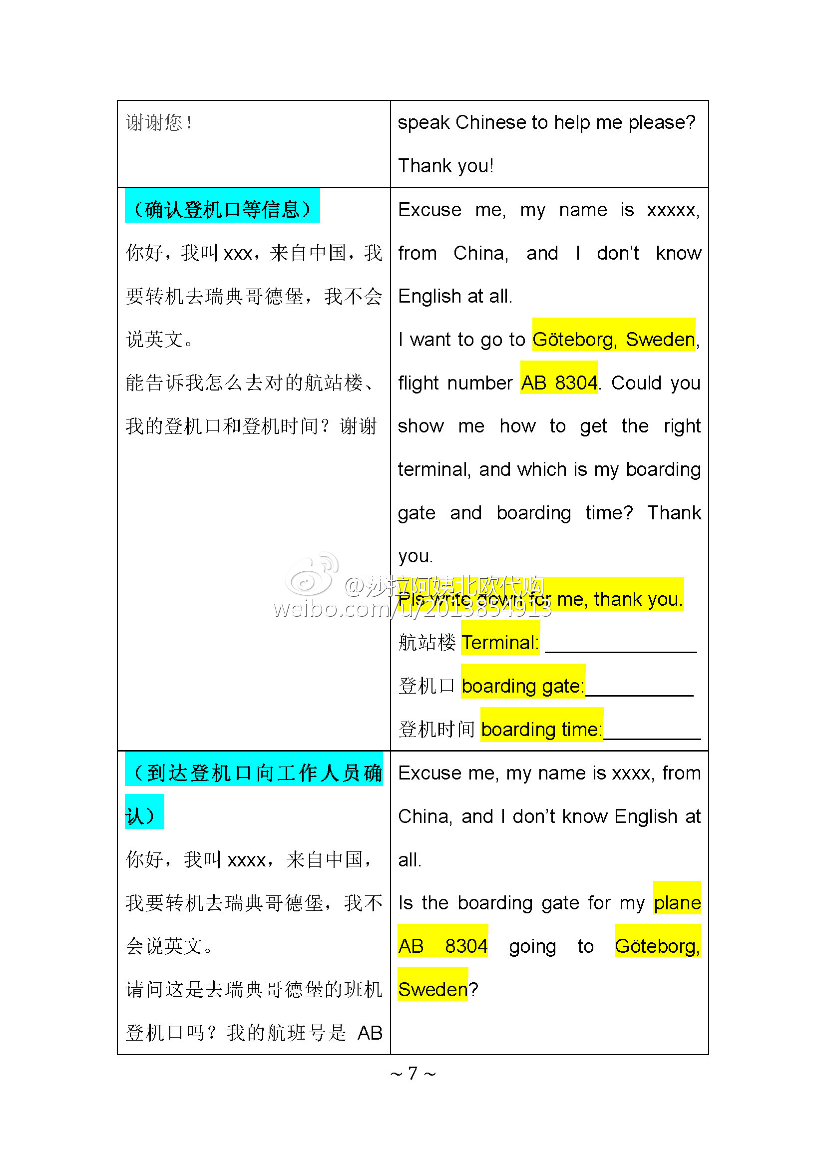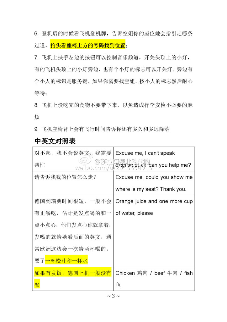 @莎拉阿姨北欧代购 我妈单独乘机来的哥德堡,转机2次,不会英文没出过国,定的是单程国航的机票。出发前我也挺担心的,做了最差的打算就是她到了德国要是没赶上来哥德堡的飞 机,我们再飞去德国接她。结果一切都顺利,这是给我妈准备的一些tips,分享给大家,一定要打印大的字体,老人眼神都不大好![[心] [心]](http://img.t.sinajs.cn/t4/appstyle/expression/ext/normal/40/hearta_org.gif)
