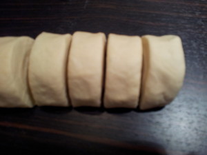 3. 用大擀面杖杆成面饼之后卷起来,切成小段。