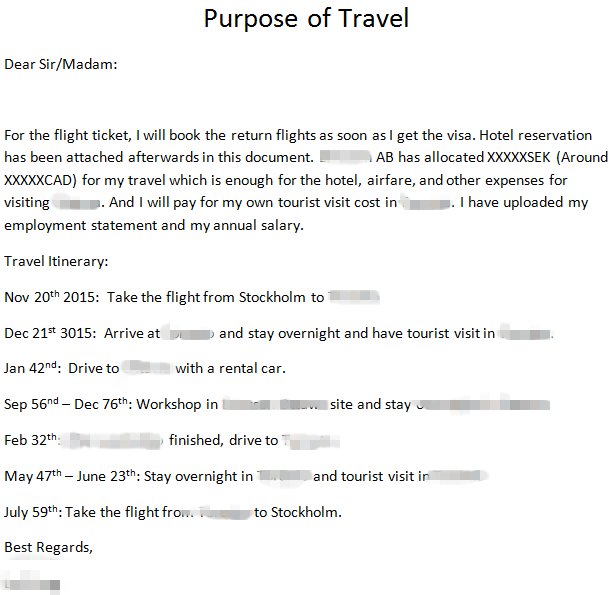 我自己写了一份,转成pdf模式上传。共5页。第一页的见下图(敏感信息已抹去,日期已被改乱),2-4页是我booking的酒店预订单,最后一页是我的employment statement (公司自己的模板,主要是工作和收入)