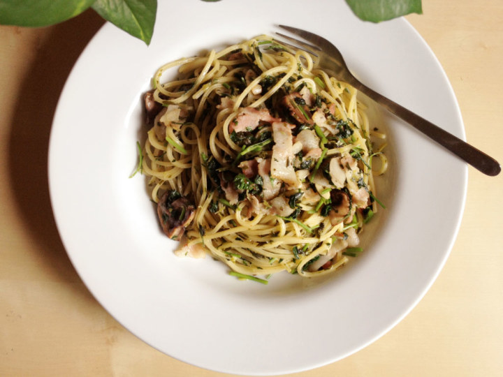 另一种算不上中式做法,却依然符合中式口味的方法是使用罗勒制成的青酱拌意面。意面可谓是留学生的恩物,原料简单,制作方便,一次做上一盒,几天的午饭问题都得到了解决。青酱意面的传统做法是以鲜罗勒和松子磨碎,加橄榄油等调酱,不过省力的话可以选择图中这种用鲜罗勒切碎制成的罗勒酱(Basil Paste), 培根蒜蓉炒香,加入煮熟的意面和罗勒酱与胡椒翻炒即可。如果说传统番茄调味的红酱意面是阿朱做的菜,娇红芳香,那么青酱意面就是阿碧做的菜,碧绿清新,春日品尝,别有一番味道。