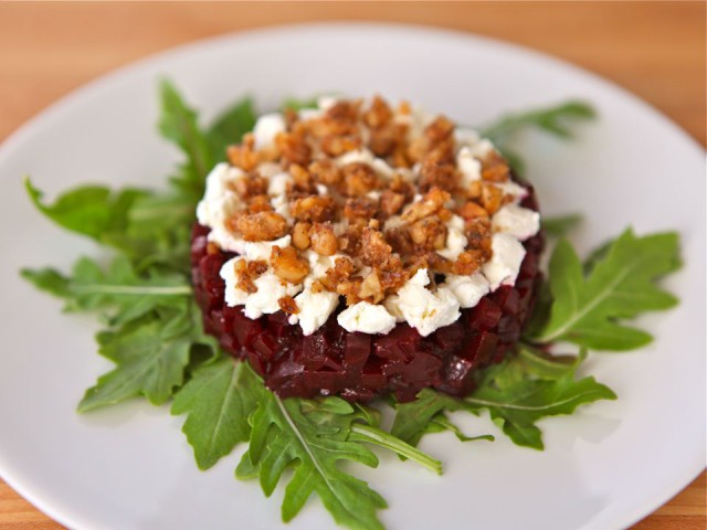 上一条提到甜菜,就来说说各种块根的食用。甜菜在国内似乎主要用于制糖,还记得中学地理课讲到我国北方制糖多用甜菜,南方制糖多用甘蔗,少有见到直接食用甜菜的。美国超市中甜菜根单独出售,烤或煮后直接吃或者拌沙拉都不错,口感上甜蜜中有点土味可能是唯一需要注意的。当然,这种在国内用来喂猪的土气蔬菜也可以十分高大上,比如下图所示的,西雅图某家餐厅的鞑靼甜菜(Roasted Beet Tartare)。鞑靼的鞑,就是驱除鞑虏中的鞑,也就是在中世纪令整个欧亚大陆为之战栗的蒙古铁骑。鞑靼牛肉(Steak Tartare)是欧洲料理中的名菜,起源于鞑靼人在行军途中将生牛肉或者马肉压在马鞍下,经长期压力使得肉质松软,然后剁碎,加入香料,打上生鸡蛋食用。这种吃法听起来就有些彪悍,对材料的要求也很高,不妨尝试概念类似的鞑靼甜菜,只需把普通的油醋拌甜菜切碎成丁,与咸味或淡味奶酪,比如Feta,整型成圆柱即可。